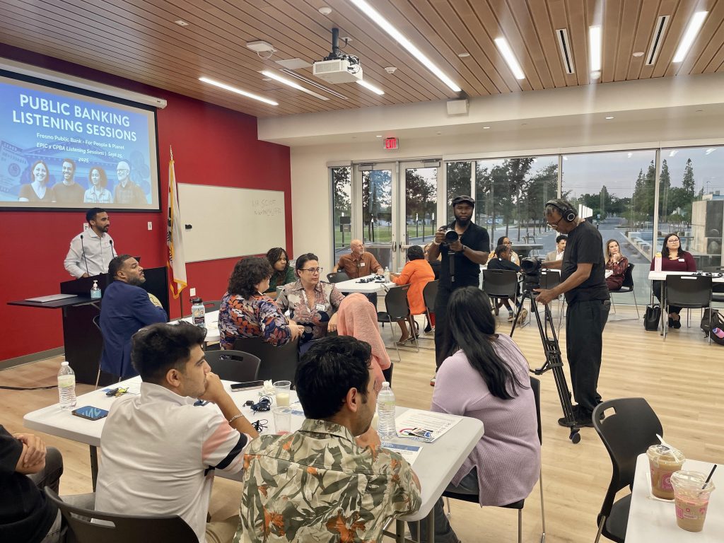 Held at Fresno City College on September 25, the session brought together dozens of community members, renters, small business owners, and advocates for a great conversation about unfair banking practices and what a city-run public bank could look like in Fresno. People shared stories, priorities, and ideas for how local dollars could better serve local needs, from funding affordable housing and small businesses to creating a bank with democratic, accountable governance rooted in community priorities.